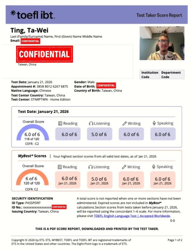 David 1/21 新制托福首戰 Home Edition出分!總分 6.0/6.0,對應舊制分數118/120